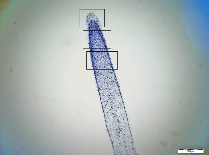 Ápice da raiz (corte longitudinal), com visualização da coifa, promeristema e meristema primário parcialmente diferenciado: meristema fundamental, procâmbio e protoderme.