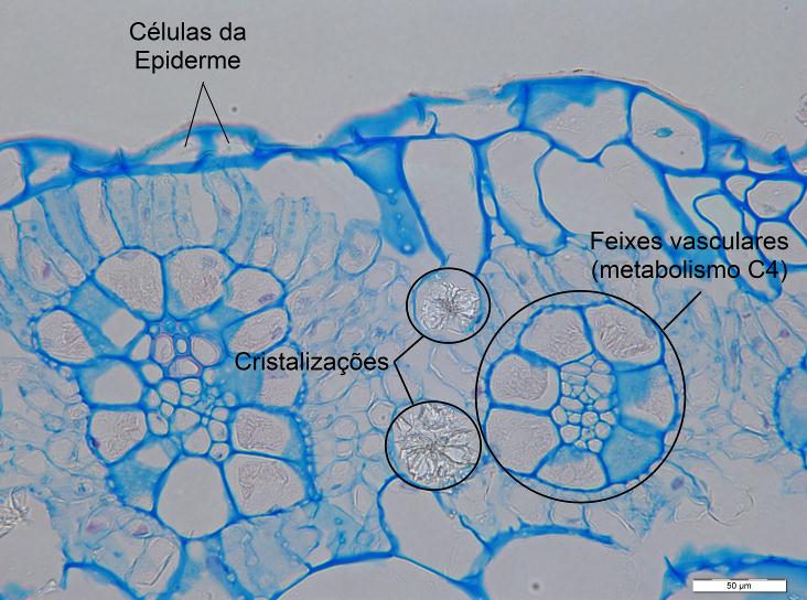 Foto 2B - Blutaparon portulacoides - Pormenor da porção adaxial da lâmina foliar, mostrando células epidérmicas, cristais e feixes vasculares com síndrome Kranz (metabolismo C4) - Foto: Kelen Veiga